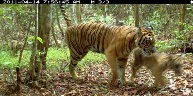WWF merilis hasil kamera infra-red, Senin (9/5/2011), yaitu rekaman foto induk harimau sumatera (Panthera tigris sumatrae) sedang bersama anaknya di kawasan hutan Taman Nasional Bukit Tigapuluh, Sumatera, 14 April 2011.