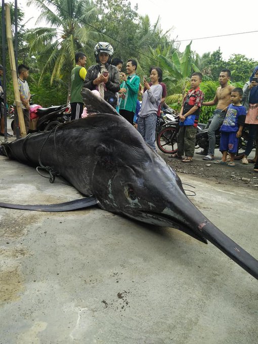 Foto-foto Digotongnya Ikan Marlin Berbobot 250kg yang Terjaring Pukat Nelayan di Pantai Pangandaran, Lihatnya Sungguh Bikin Mulut Menganga.